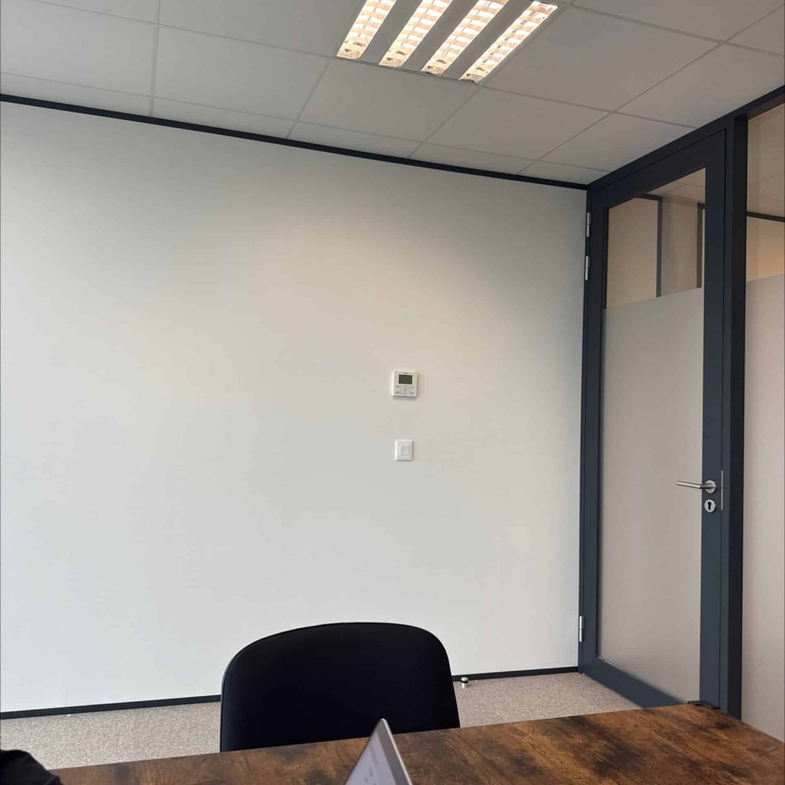 Nous travaillons avec des matériaux courants et robustes : plaques de plâtre et ossature métallique pour cloisons, vitrages opaques ou sablés pour portes intérieures, plinthes PVC ou bois, peinture acrylique ou glycéro pour finition, dalles de plafond suspendu et profilés d’éclairage encastré selon le besoin. Les choix seront proposés en fonction de la durabilité attendue et du rendu esthétique recherché.